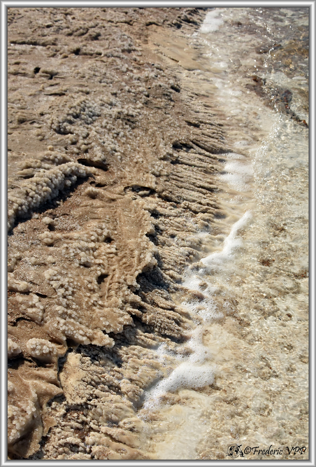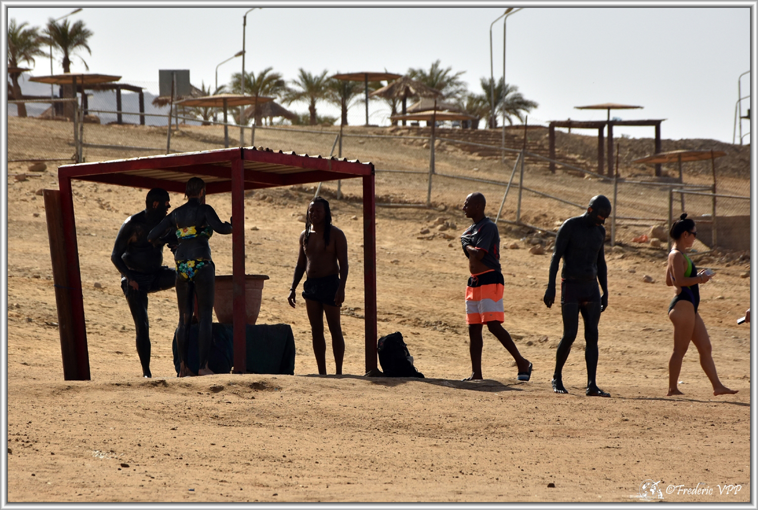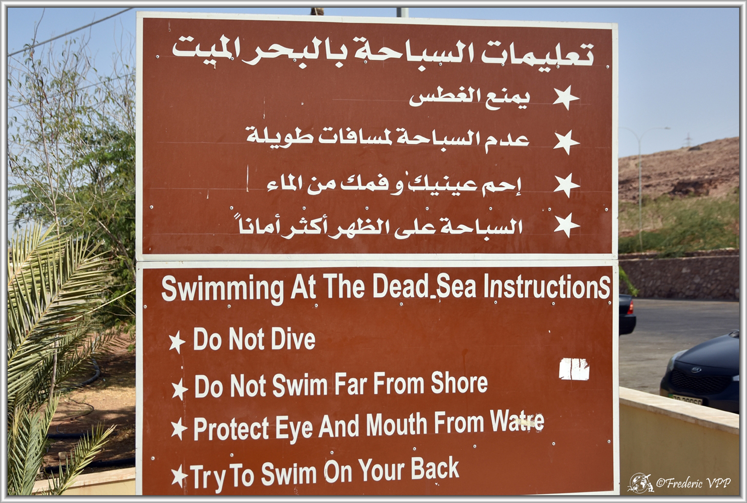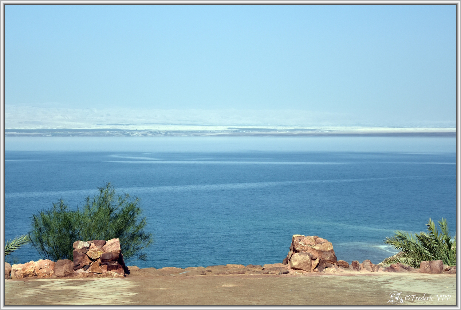 The Dead Sea: Even having visualized the extent of the Dead Sea on Google Map, I did not expect such a huge place. Opposite, the hills of Israel seem so far away. I was only able to soak part of the legs because the salt present gnaws the skin quite easily and I was able to realize that... The background color looks like marble in some places but that's the mixture of salt and sand which gives this mottled appearance. I picked up a white pebble and in the end it was just agglomerated salt. People are covered in black mud, which is good for the skin. On the other hand, signs point out the dangers of bathing in the Dead Sea.