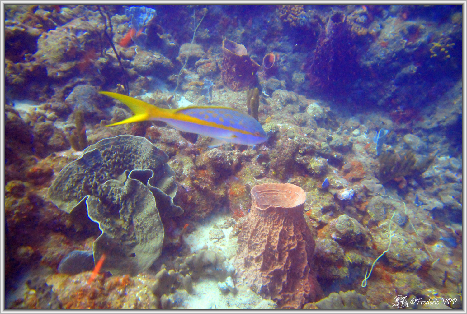 Pointe Plate: A field of multicolored sponges, of all kinds a first small arch, and in the background, the intense blue of the open sea.