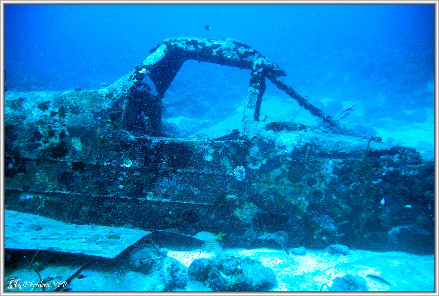 L'avion (22m/72ft): This small agricultural plane, a CESSNA 188, was used in its first life for the spreading of pesticides on banana plantations. Following an accident, it could not be repaired. It was submerged after depollution in 2000. Sponges, sea squirts, corals settled there. The wreck also serves as a shelter for angelfish, butterflyfish and lionfish.