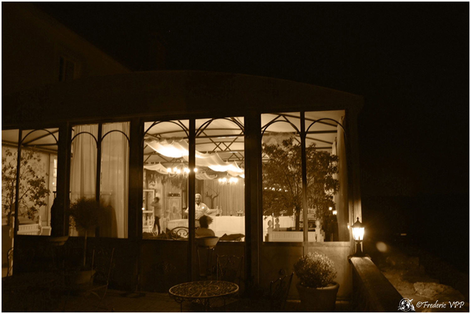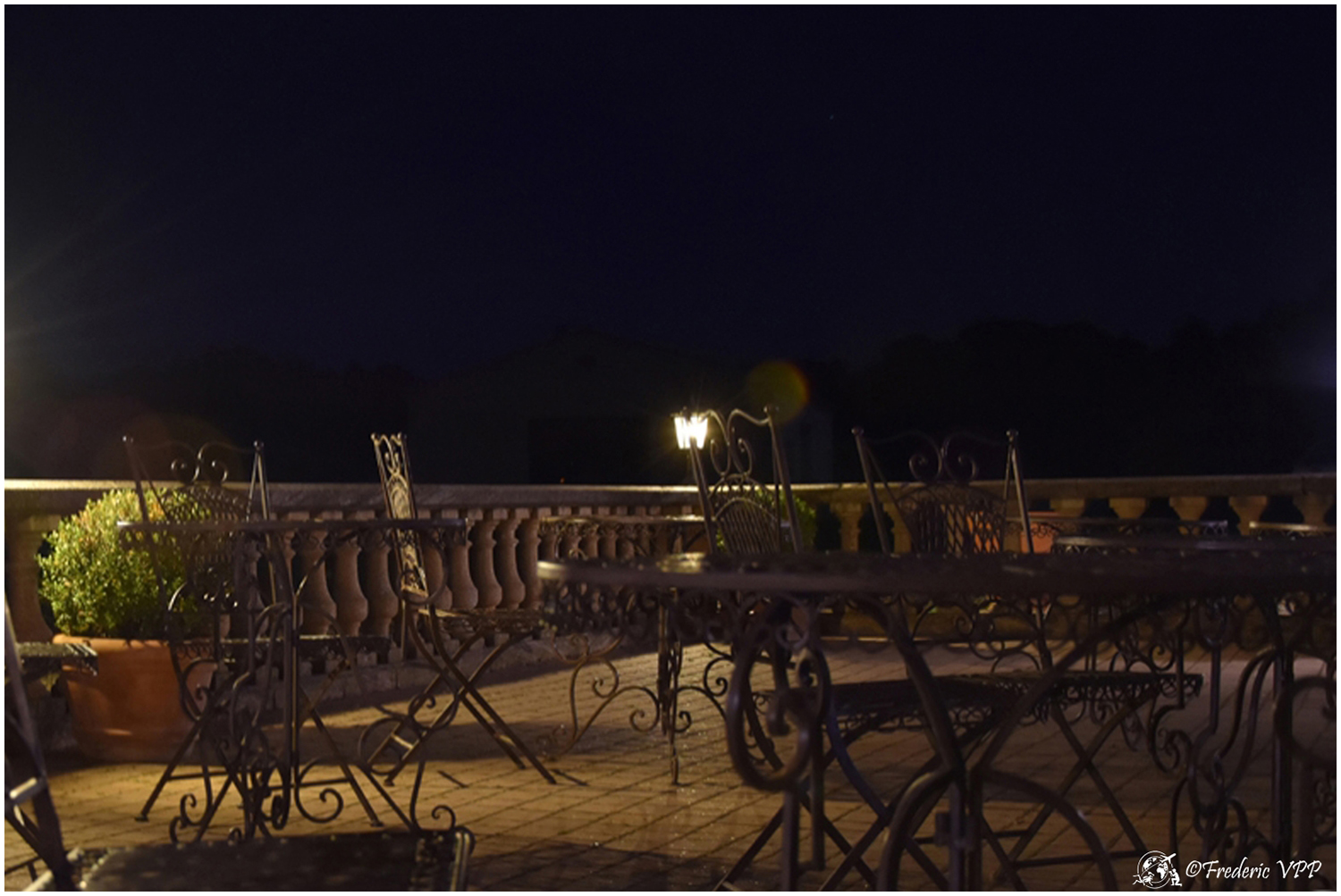Where does this road lead, I wouldn't have time to think about it. Doumette yells "Left" at me. A simple dirt road sinks into the night. Then we cross two columns emerging from nothingness... A hedge winds its way through the night with small pedestals straight out of the past. Then a majestic mansion appears in the night. Lit from all sides, it looks like a lighthouse in the middle of the ocean. This place seems steeped in history... As we approach, life reappears, we hear a musical background that becomes clearer as we approach.... The starry sky is conducive to daydreaming...