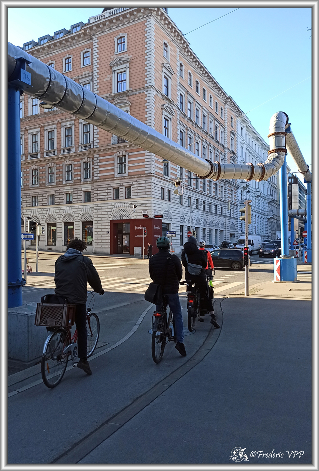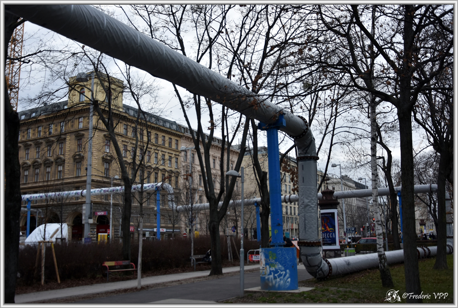 Des tuyaux traversent, en hauteur, une grande partie de la ville. Comme le centre ville est en travaux, j'ai pensé que c'était pour protéger les tuyaux en attendant de les enterrer. Et Non !!! Il s'agit d'un système de climatisation à partir de l'eau du Danube.