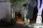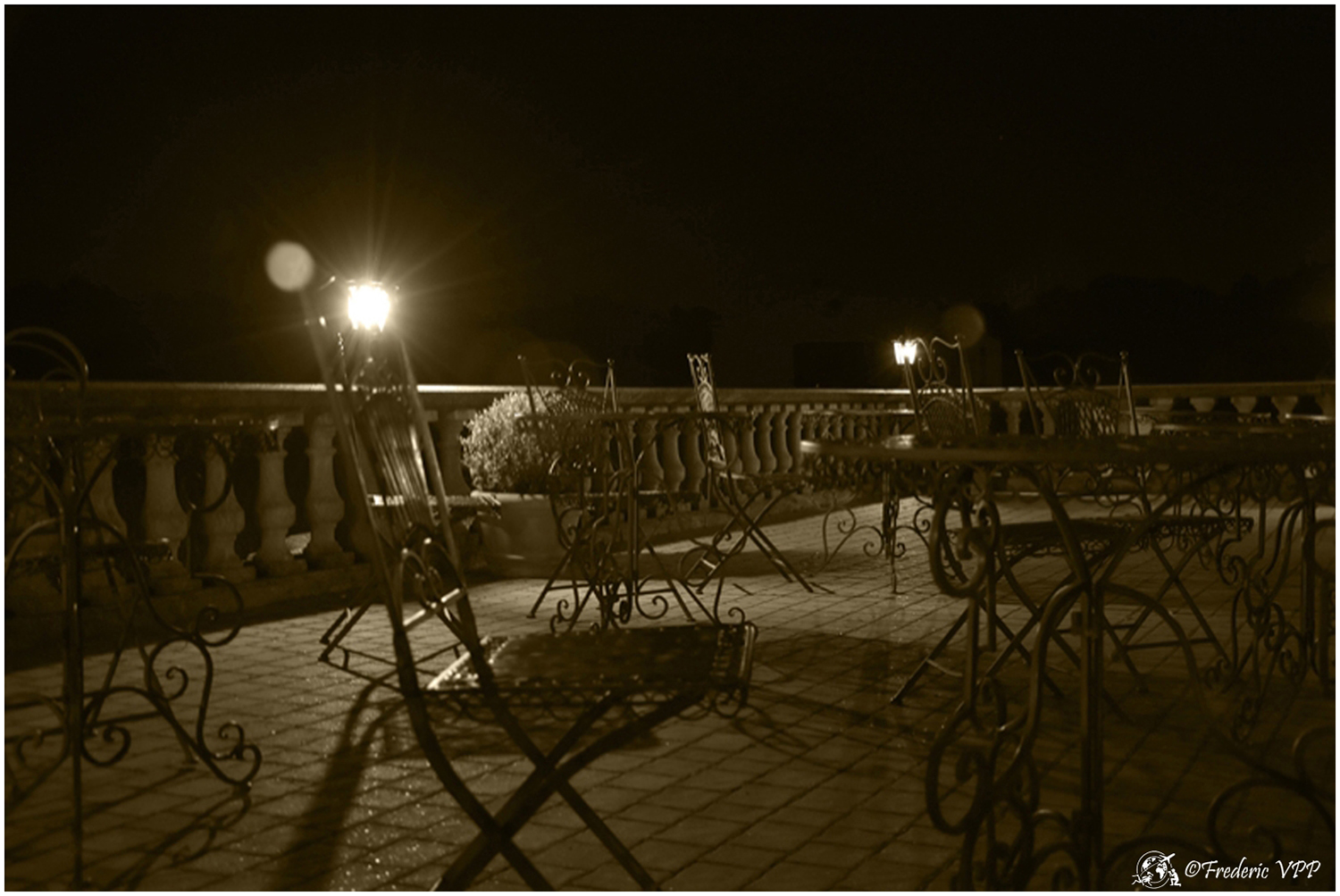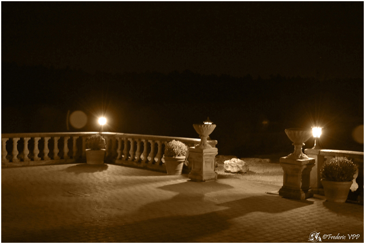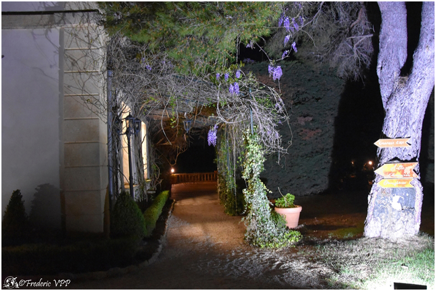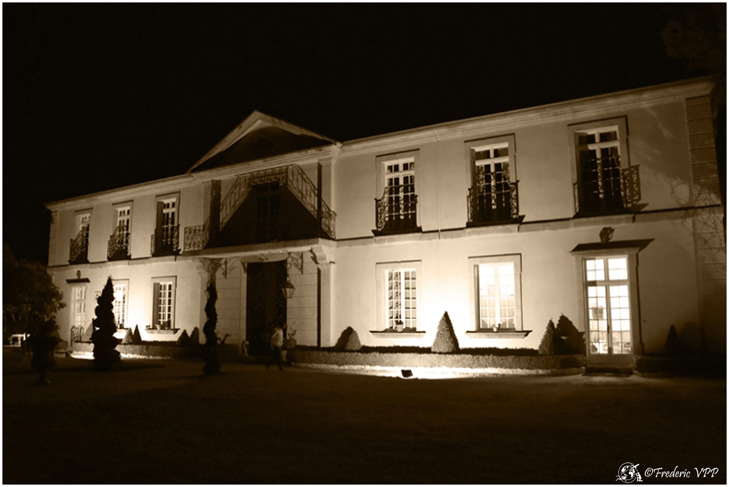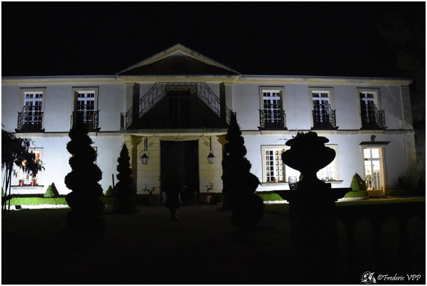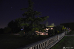 Where does this road lead, I wouldn't have time to think about it. Doumette yells "Left" at me. A simple dirt road sinks into the night. Then we cross two columns emerging from nothingness... A hedge winds its way through the night with small pedestals straight out of the past. Then a majestic mansion appears in the night. Lit from all sides, it looks like a lighthouse in the middle of the ocean. This place seems steeped in history... As we approach, life reappears, we hear a musical background that becomes clearer as we approach.... The starry sky is conducive to daydreaming...